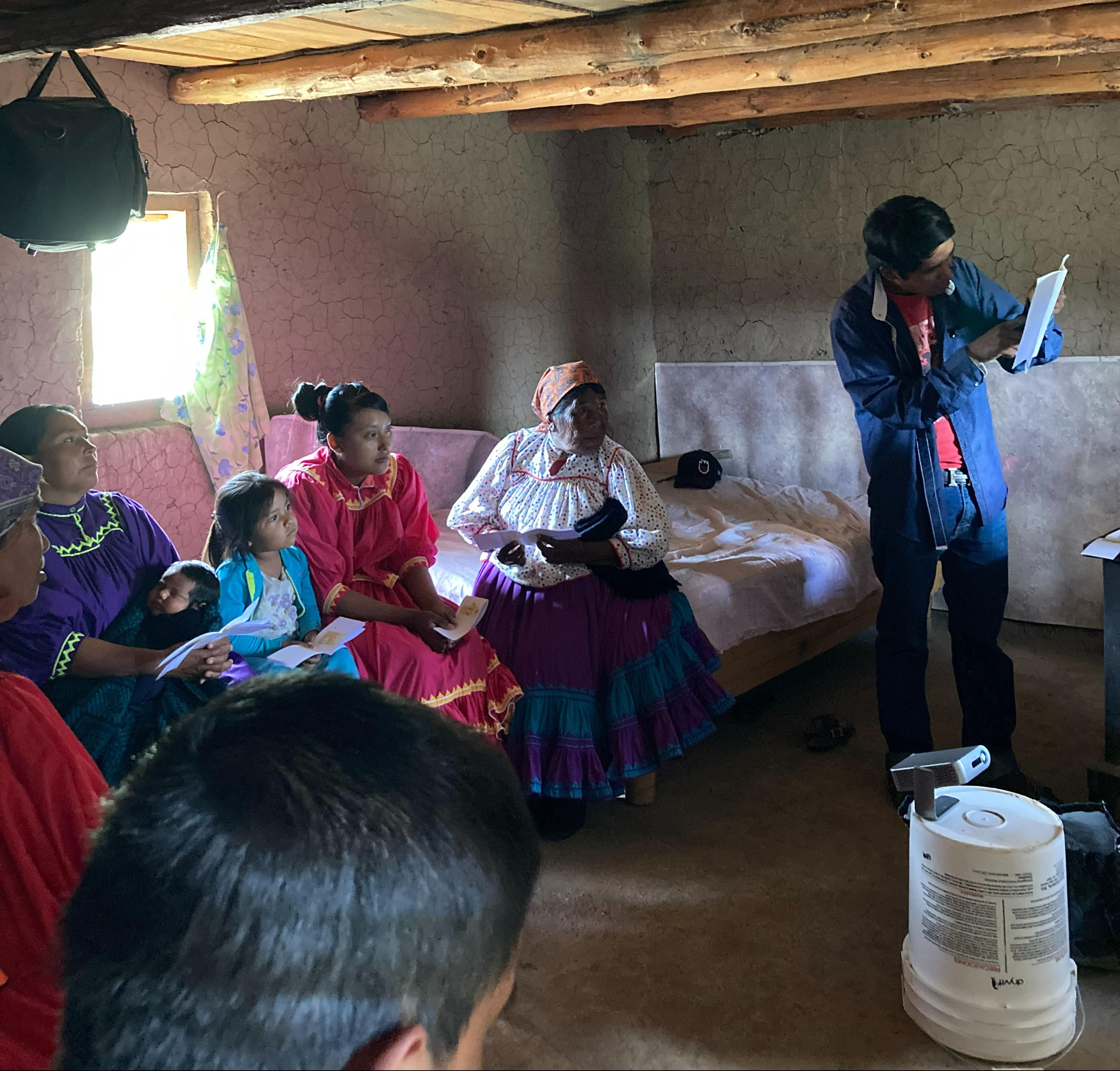 Later that day, Lupe and the missionary showed a Bible story video on a battery-powered projector to a group of men, women and children gathered in a log cabin. The Tarahumara people were given a booklet composed of pictures that illustrate the main points of the story. Lupe excitedly taught the story, then prayed over the group before they departed for their isolated villages. These oral learners can then take their picture-driven Bible story books home and retell the story, thus ensuring that the Word of God is being shared by the Tarahumara people in settings beyond the meeting location.